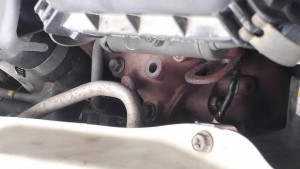 入庫時の調査で空吹かしを何度か行ったが音は発生しなかったが実際に走行してみると確かに加速中に音が鳴っていた。「ガラガラガラ」と音が大きかったので部品の破損があるのは明らかだった。エンジンルームの点検・調査でエキゾストマニホールドの遮熱板のボルトが高熱により錆びて痩せ細くなって遮熱板がグラついていたが音の原因ではなかった。ターボチャージャーからセンターパイプの点検のためフロントバンパーを取り外して各ボルトの緩みを調べていたらエキゾストマニホールドとターボチャージャーの接続部のボルト3本中の1本が折れていた(下部に写真)。エアクリーナーとインタークーラーを外してからターボチャージャーを取り外しにかかる。折れたボルト以外の2本も変色や錆びがあったので同時に交換をした。また、エキゾストマニホールドの遮熱板の6mmボルトも錆びて細くなっていたので交換をした。また、ターボチャージャーのオイルパイプのパッキン・ガスケットも交換をする